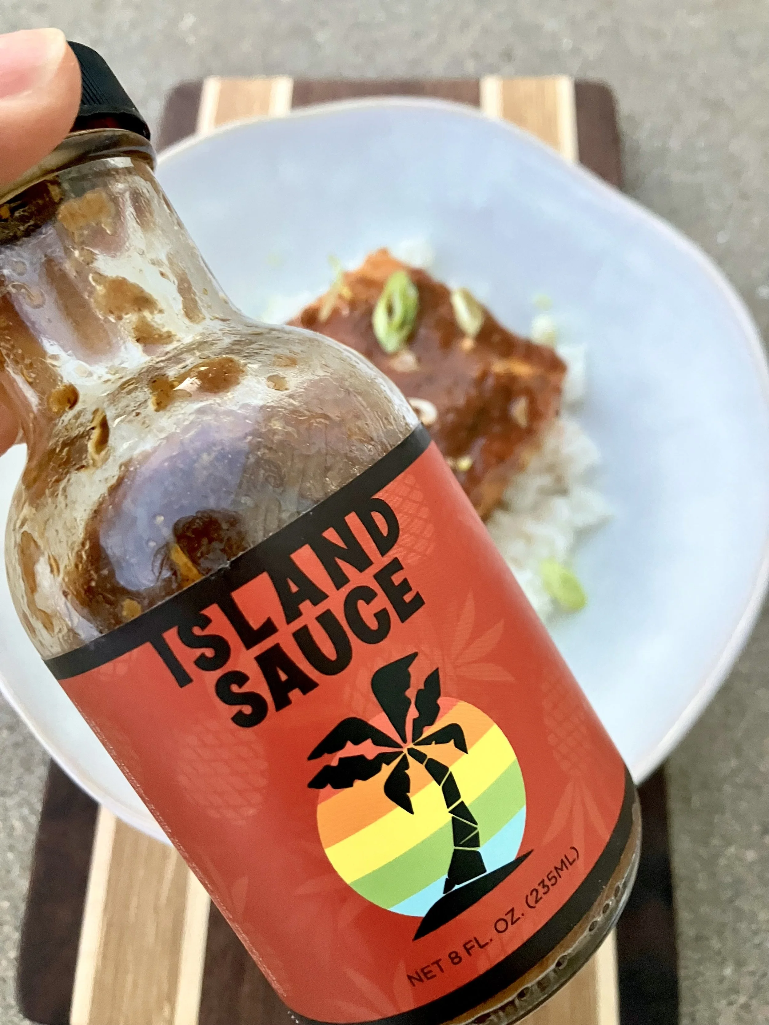 Serve cooked salmon over a bed of rice, with another slather of Island Sauce and sliced scallions.